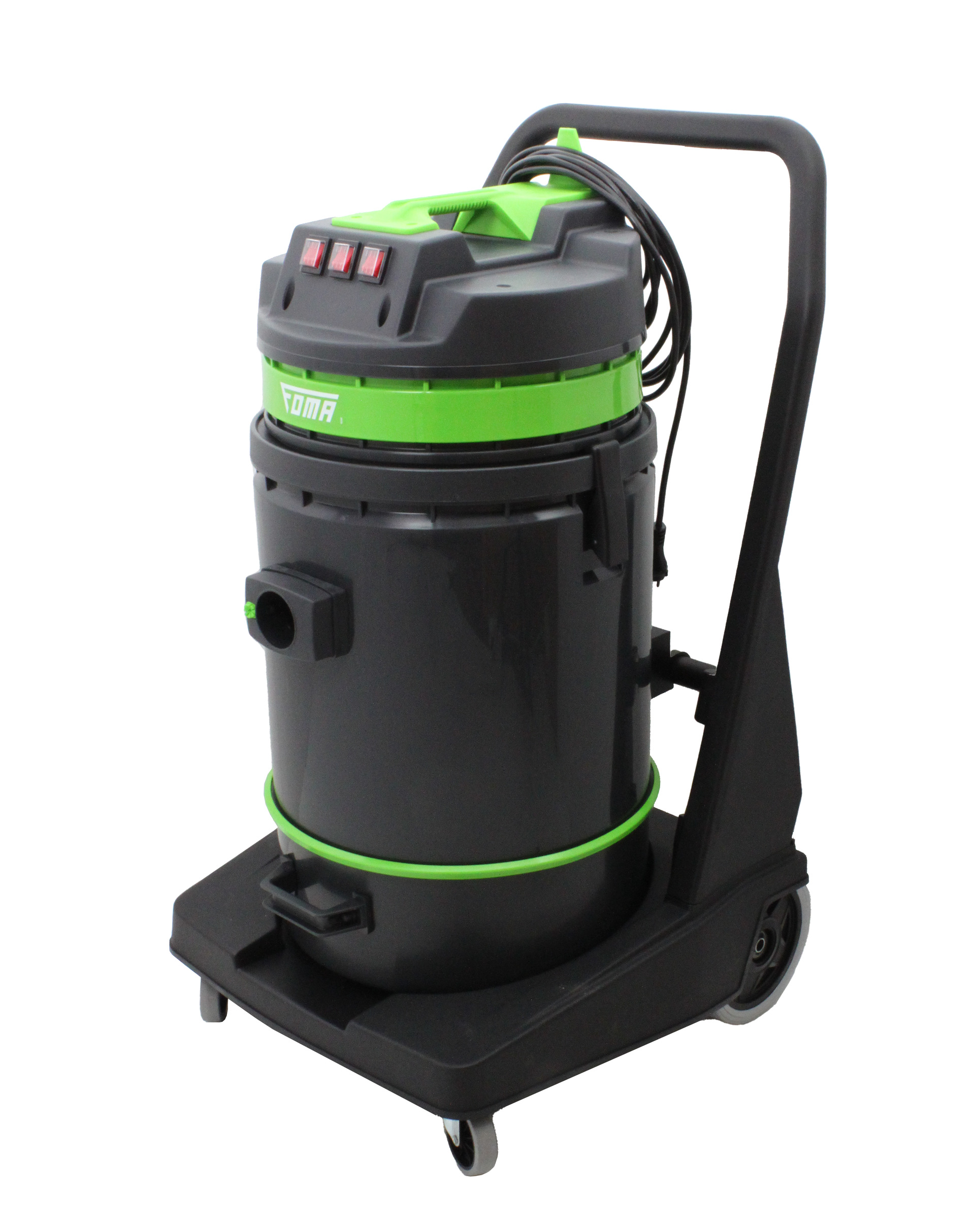 Produktinfo.FOMA 3500 is a wet & dry vacuum cleaner with a large tippable container. The trolly, which is molded in polypropylene plastic, has 2 large rear wheels and 2 swivel wheels at the front. It is equipped with three powerful two-stage suction turbines with by-pass cooling on 1200 watts each and an efficient filter system. Cyclone separation in the tank before the filter makes the FOMA 3500 extra efficient. An excellent machine for craftsmen, contractors, farmers or for industrial companies who want an extra powerful and robust machine.