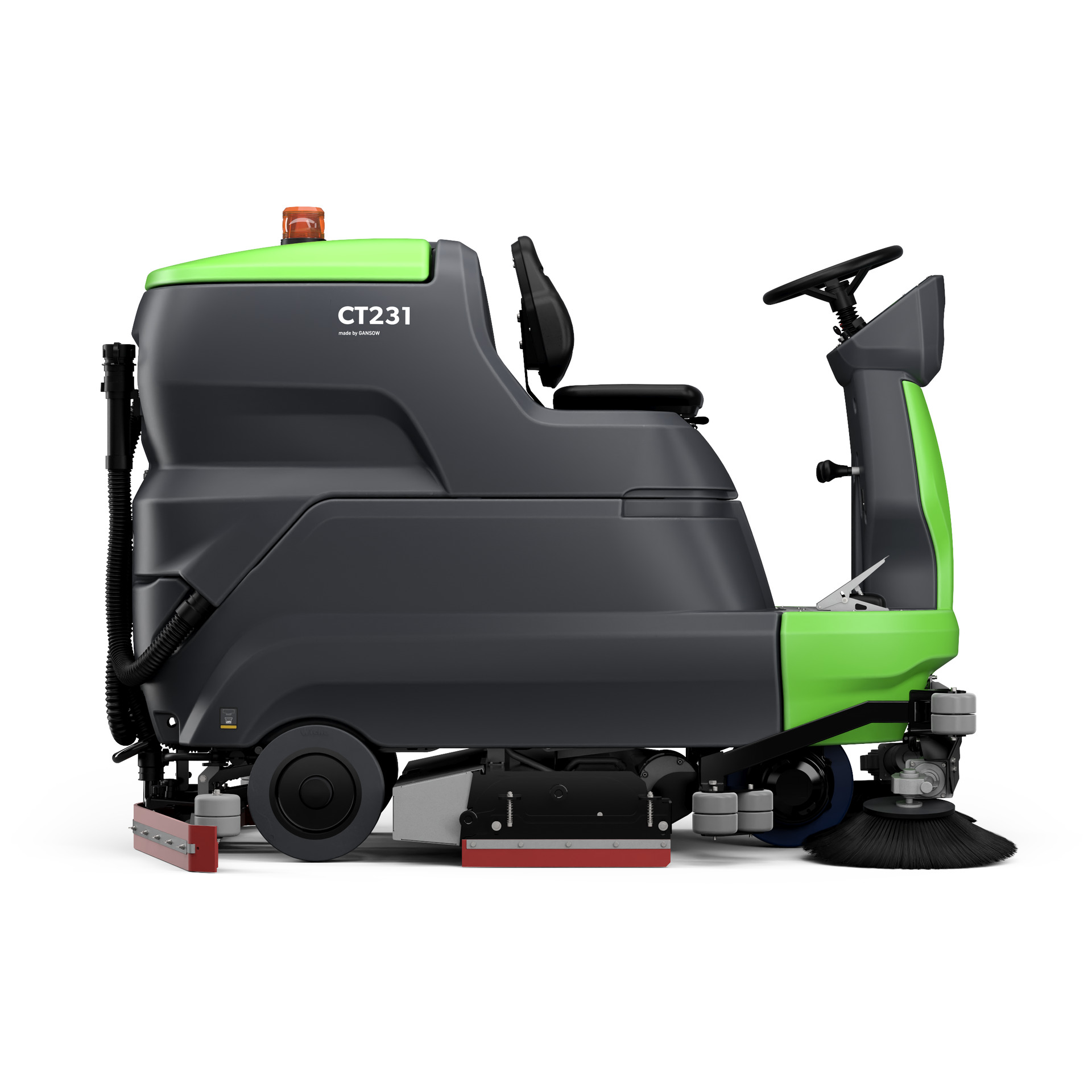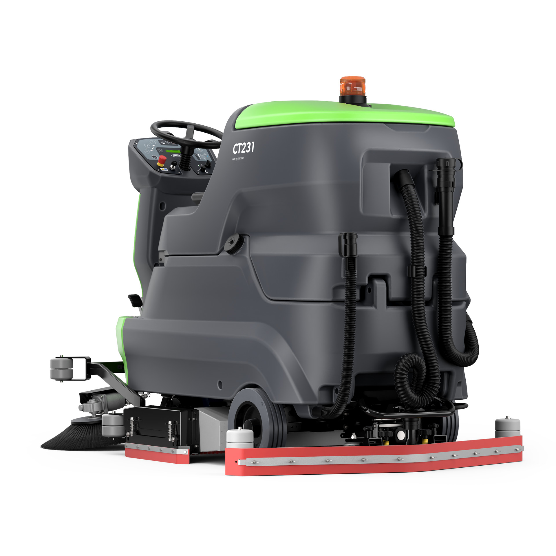 Produktinfo.CT231 BT100R er en sittbar gulvvaskemaskin med høy effektivitet. Maskinen har stor rentvannstank på hele 220 liter og skittenvanntank på 230 liter som gir lang operasjonstid. Maskinen er selvgående, og har trinnløs hastighetsregulering på drift forover og bakover.Sweep børstene i front gjør det lettere å rengjøre på trange steder. På CT231 BT100R er trykket på skurebørstene fast innstilt i de 3 programmene, men dette kan regulerers i programvaren. Ettersyn av batterier, filtre og slanger er svært enkel, fordi hele karosseriet kan vippes bakover. Karosseriet er i slagfast polypropylenplast. Maskinen har som standard 3 stk. vaskeprogram: 1 - for rengjøring av glatte gulv som ikke er altfor skitne. 2 - for rengjøring av glatte gulv som er merkbart skitne. 3 - for svært skitne og grove betong gulv og lignende. Under kjøring i de overnevnte programmer så kan vannmengden trinnløst reguleres. Børster, sugemotor og pålegging av vann/vaskemiddel stopper automatisk når maskinen stopper. Dette gjør maskinen meget enkel i bruk.