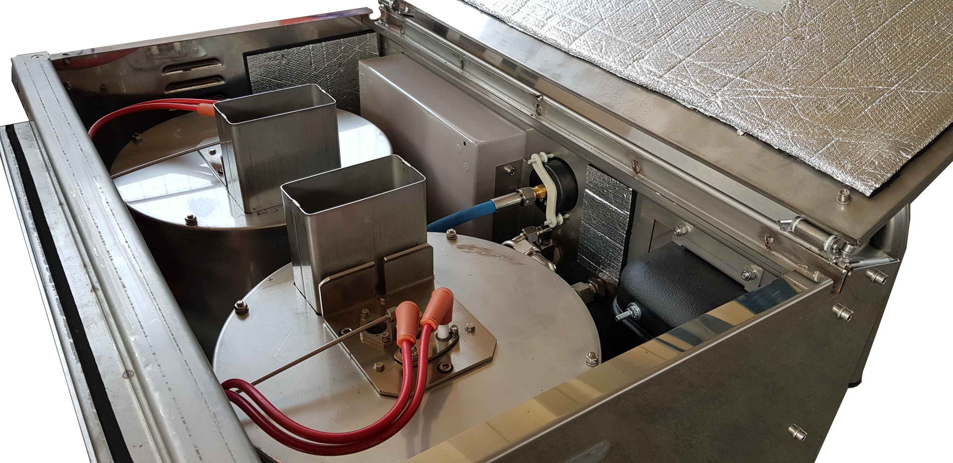 - Struktur i rustfritt stål AISI 316 med dobbelt antivibrasjonssystem, med avtagsbart karosseri i rustfritt stål AISI 316.