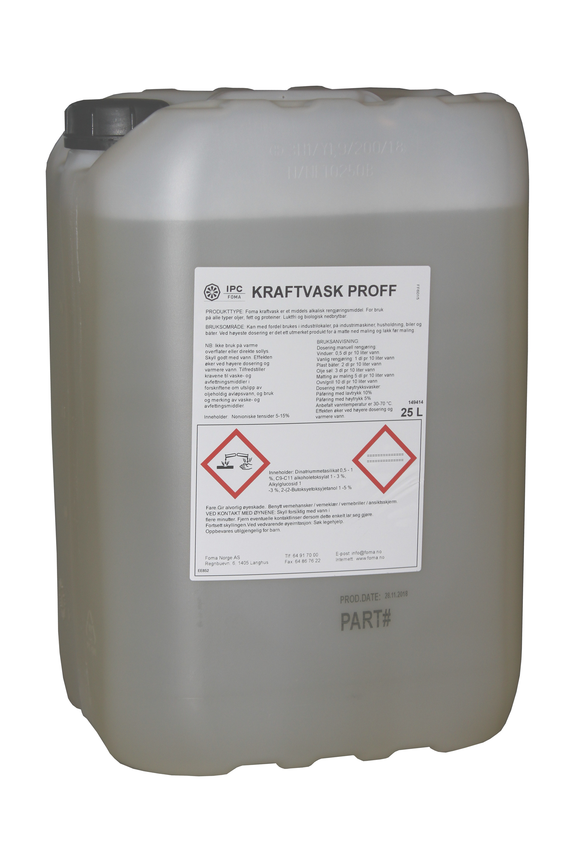 Produktinfo.Kraftvask er et middels alkalisk rengjøringsmiddel. For bruk på alle typer oljer, fett og proteiner. Luktfri og biologisk nedbrytbar