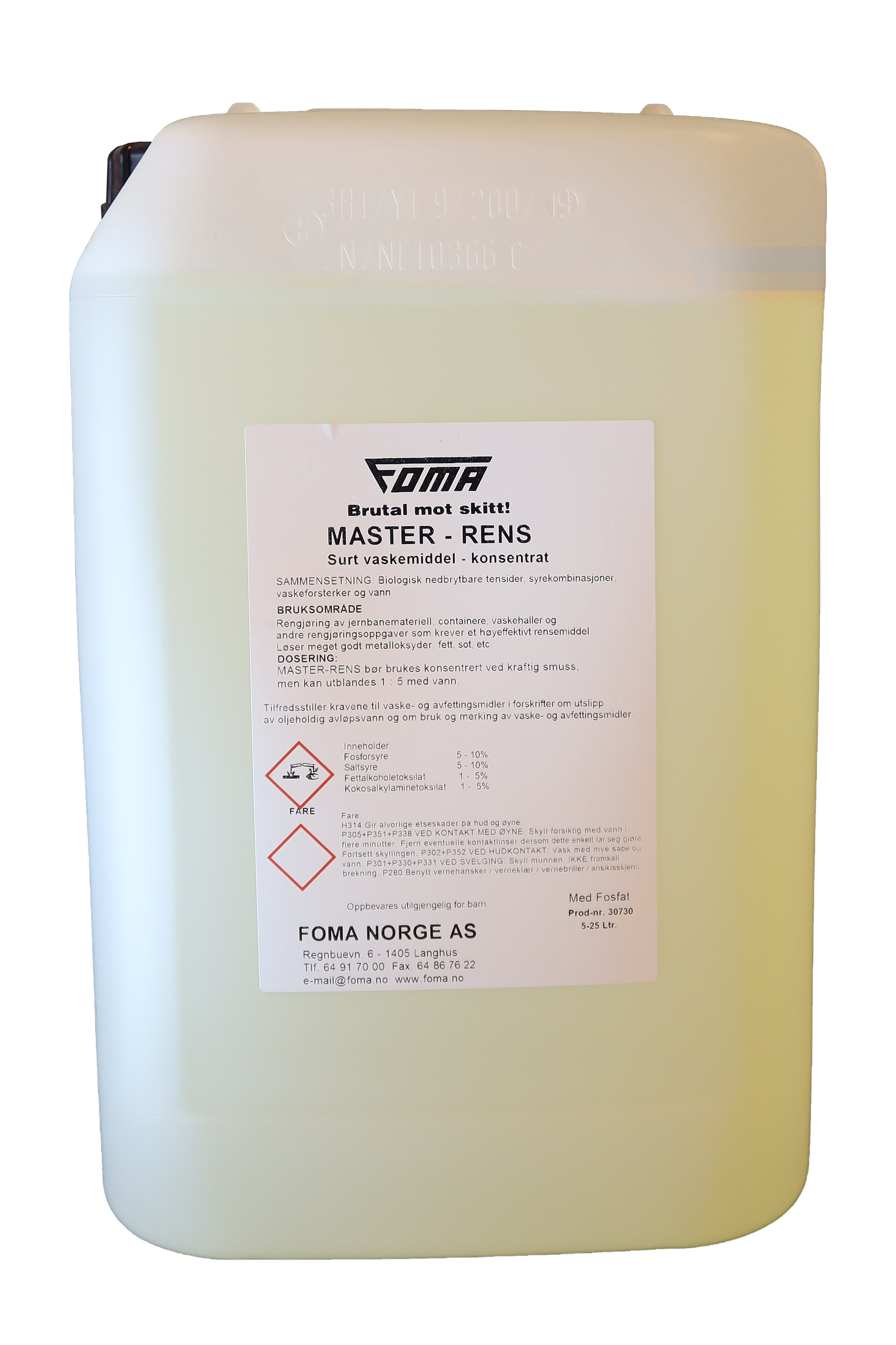 Foma Master Rens er sterk etsende og må behandles med verneutstyr. Biologisk lett nedbrytbare tensider, syrekombinasjon og glykoleter. pH 1 i konsentrat. Vannløselig i alle forhold.
