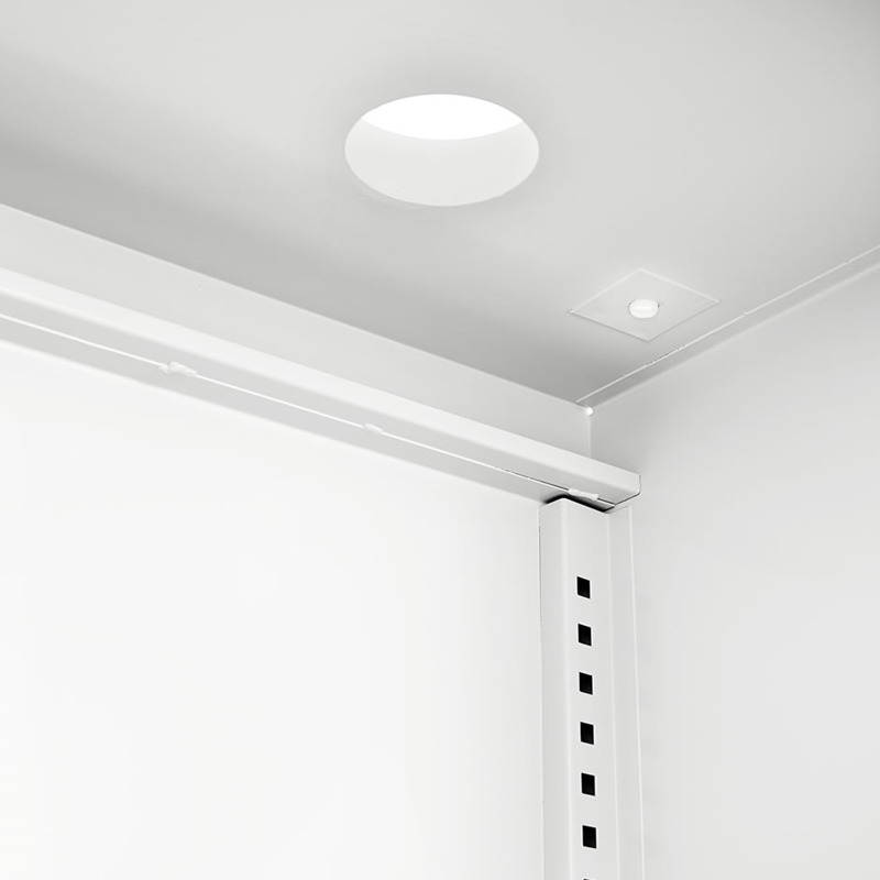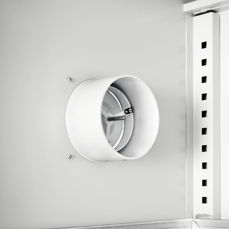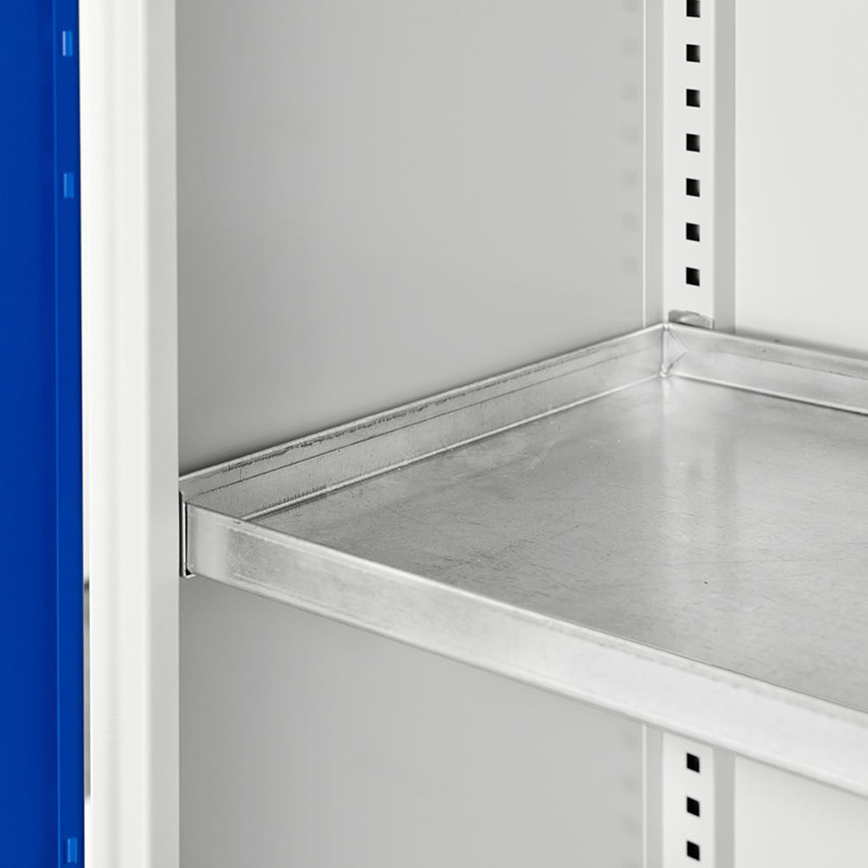 Det klassiske kjemikalieskapet med 30L oppsamlingskar (ikke på bildet) nederst i skapet. Skapet er helsveiset, hyllene har spillkant. Maks belastning pr hylle er 70 kg. Kraftige skinner i ryggen på skapet, som brukes til hyller og uttrekkbar skuff. Tallerkenventiler i siden, og stuss for tilkobling av avtrekk i toppen av skapet. Skapet leveres med grått skrog RAL7035 og blå dører RAL5010.
