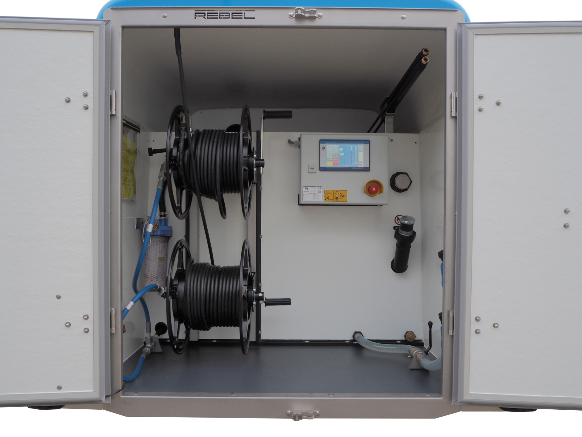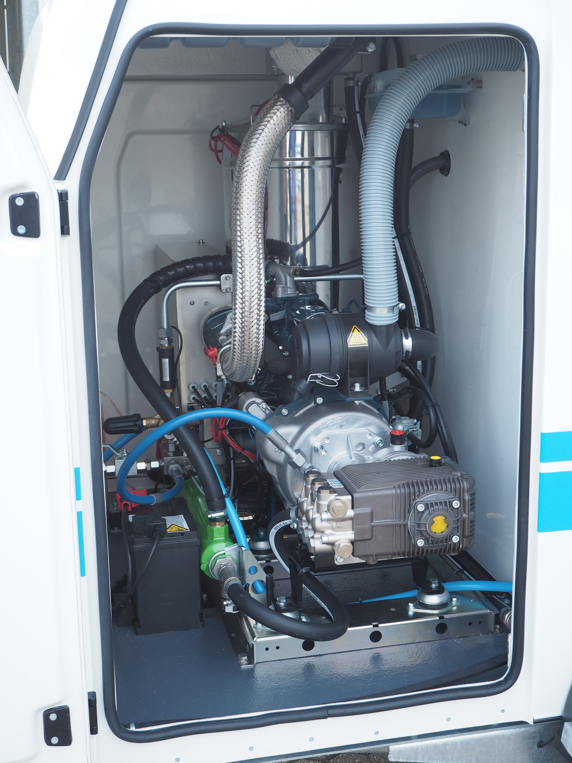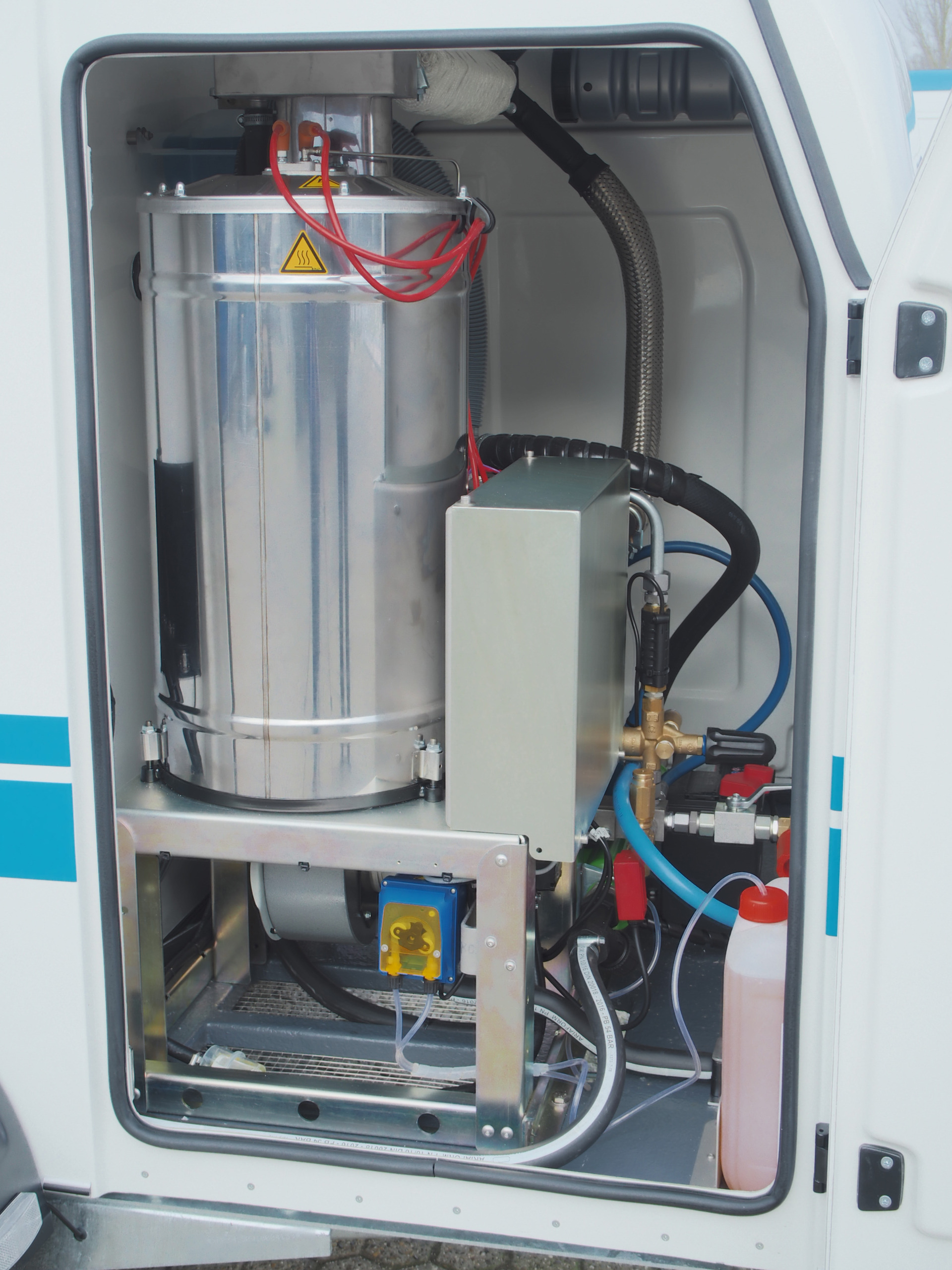 montert i en lukket skaphenger. Skaphengeren er laget i polyester og med forseglet bunn, noe som gjør den vanntett. Systemet driftes av en vannavkjølt Kubota dieselmotor. WeedMaster TM 221 har en mengde sikkerhetssystemer og er miljøvennlig og energibesparende. Den har en Aquabar saktegående stempelpumpe med rustfrie ventiler og justerbart trykk. Maskinen leveres med vannfilter på vanninntaket, 75 liter vanntank og avkalkningsfunksjon og har et kontrollpanel for justering av funksjoner og avlesning av verdier i forbindelse med bruk. Fjernkontroll kan bestilles separat.