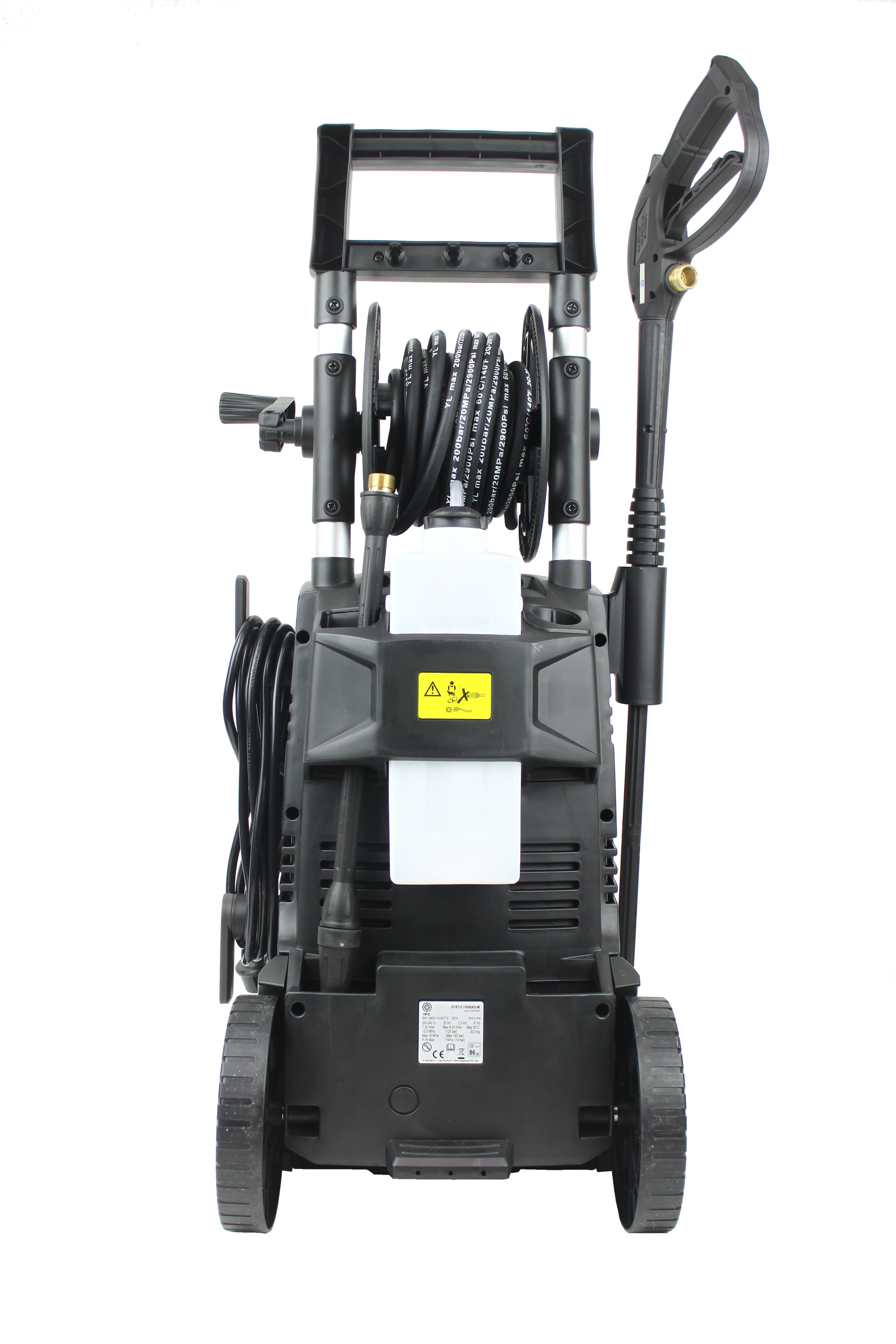 Produktinfo.PW-C23F 1608 er en brukervennlig og kraftig høytrykksspyler og er utstyrt med hele 10 meter stålarmert høytrykkslange. Med 160 bar og 480 l/t får du en meget allsidig høytrykksspyler for de tøffere rengjøringsoppgavene. Det er god lagringsplass for utstyret på maskinen og den leveres med en integrert såpetank med justerbar innblanding. Sikringsstørrelse på denne ligger fra 10-11 Ampere, så på eldre, raske sikringskurser kan det hende at den slår ut.