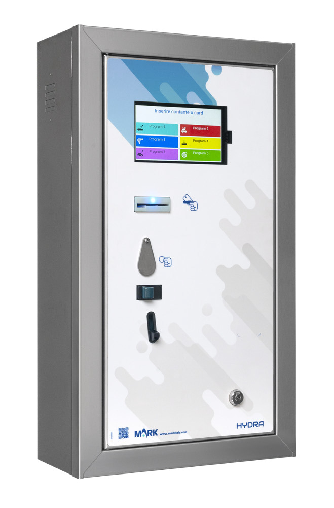 Hydra touch har mulighet for å tilkobles opp til 6 enheter/programmer (f.eks. høytrykk, skum, avfetting, støvsuger, osv.)med pris per minutt-innstilling i hvert enkelt program. Standard er Hydra touch utstyrt med elektronisk mynt/pollett innkast, men kan i tillegg utstyres med kontantløse systemer som RFID kort/nøkkel eller Nayax VISA/Mastercard automat. Skapet er laget i rustfritt stål (AISI 304) og har et 4-punkts låsebeslag i døren. Automaten er for montering på vegg.